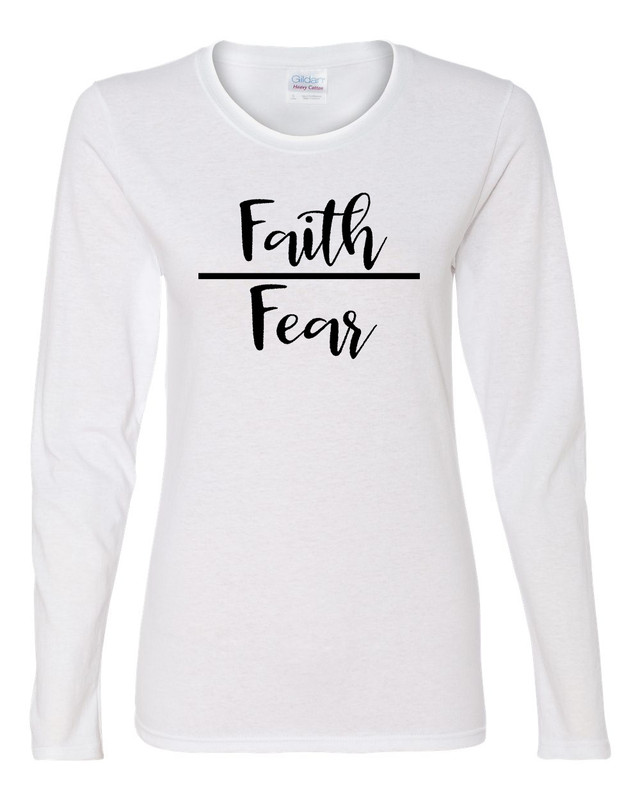 Spread a fun and inspiring message everywhere you go in this ladies Faith Over Fear tee. This Christian, women's long sleeve t-shirt is sure to make a statement and let others know what you believe in. Made of a soft and comfortable 5.3 oz, 100% preshrunk heavy cotton. Ash Grey is 99% cotton, 1% polyester Sport Grey is 90% cotton, 10% polyester. Features taped shoulder-to-shoulder and neck double-needle stitching collar, sleeves, and bottom hem and sideseams with slightly tapered Missy fit. Machine wash cold inside out. Tumble dry low. Multiple colors to choose from. Available in sizes XS-3XL. Treat yourself or give as a gift. Great for birthdays, holidays, and special occasions. We carry and ever-growing selection of apparel to suit the needs of the whole family. All of our tshirts are printed in-house by our professional production team. This guarantees that you are getting unique, one-of-a-kind design. Our graphic t-shirts are printed in the USA with state of the art equipment to ensure vibrant colors and lasting durability. We custom design apparel for all occasions: birthdays, holidays, Christmas, anniversaries, and more. Our apparel, hats, and tumblers make a great gift for your mom, dad, grandma, wife, husband, daughter, son, friends, and co-workers!