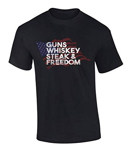Funny American Flag Guns Whiskey Steak Freedom Graphic Adult Short Sleeve T-shirt. The front of this tee features bold text reading 'Guns, Whiskey, Steak, & Freedom' along with American flag graphic. This durable, comfortable Tee is sure to be a hit for anyone who loves the essentials- whether you're buying it as a gift for somebody special or wearing it yourself. This listing is for a 5.3 oz. heavyweight 100% preshrunk cotton t-shirt (Ash Grey is 99% Cotton/1% Polyester; Sport Grey is 90% Cotton/10% Polyester; and Heather Gray is 50% Cotton/50% Polyester). We carry and ever-growing selection of apparel to suit the needs of the whole family. All of our tshirts are printed in-house by our professional production team. This guarantees that you are getting unique, one-of-a-kind design. Our graphic t-shirts are printed in the USA with state of the art equipment to ensure vibrant colors and lasting durability. We custom design apparel for all occasions: birthdays, holidays, Christmas, anniversaries, and more. Our apparel, hats, and tumblers make a great gift for your mom, dad, grandma, wife, husband, daughter, son, friends, and co-workers!