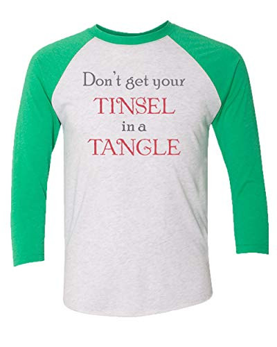 Funny Holiday 'Don't Get Your Tinsel In A Tangle' Adult Women's Baseball Tee. The holiday season can be stressful at times. This fun shirt is a great reminder to stay festive and cheery. This durable, comfortable T-shirt is sure to be a hit for anyone, whether you're buying it as a gift for somebody special or wearing it yourself. This listing is for a 4.3 oz., 50% polyester/ 25% combed ringspun cotton/ 25% rayon Tri-Blend Three-Quarter Sleeve Baseball Raglan Tee. Variety of colors and a large range of sizes are available. We carry and ever-growing selection of apparel to suit the needs of the whole family. All of our tshirts are printed in-house by our professional production team. This guarantees that you are getting unique, one-of-a-kind design. Our graphic t-shirts are printed in the USA with state of the art equipment to ensure vibrant colors and lasting durability. We custom design apparel for all occasions: birthdays, holidays, Christmas, anniversaries, and more. Our apparel, hats, and tumblers make a great gift for your mom, dad, grandma, wife, husband, daughter, son, friends, and co-workers!