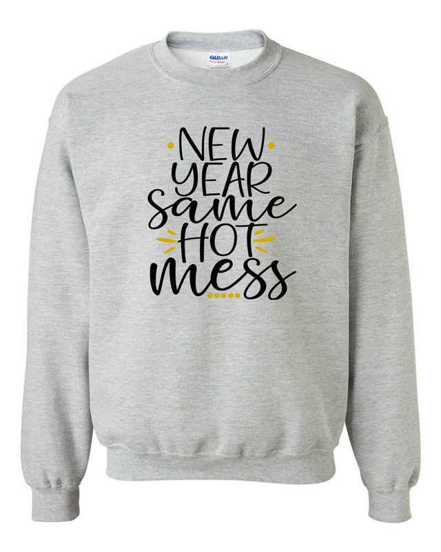 Show up to your New Year�s Eve party in our festive New Year apparel! Say good riddance to the previous year and ring in the new year in style. This super comfy sweatshirt is made of 50% cotton and 50% polyester. All Heather Sport colors are 60% cotton and 40% polyester. Double-needle stitched throughout and 1x1 ribbed cuffs and waistband with spandex. Features a classic fit with a tear away label for maximum comfort and a perfect fit. This is a back print sweatshirt with a small crest on the front left chest. Sizes Small-5X.