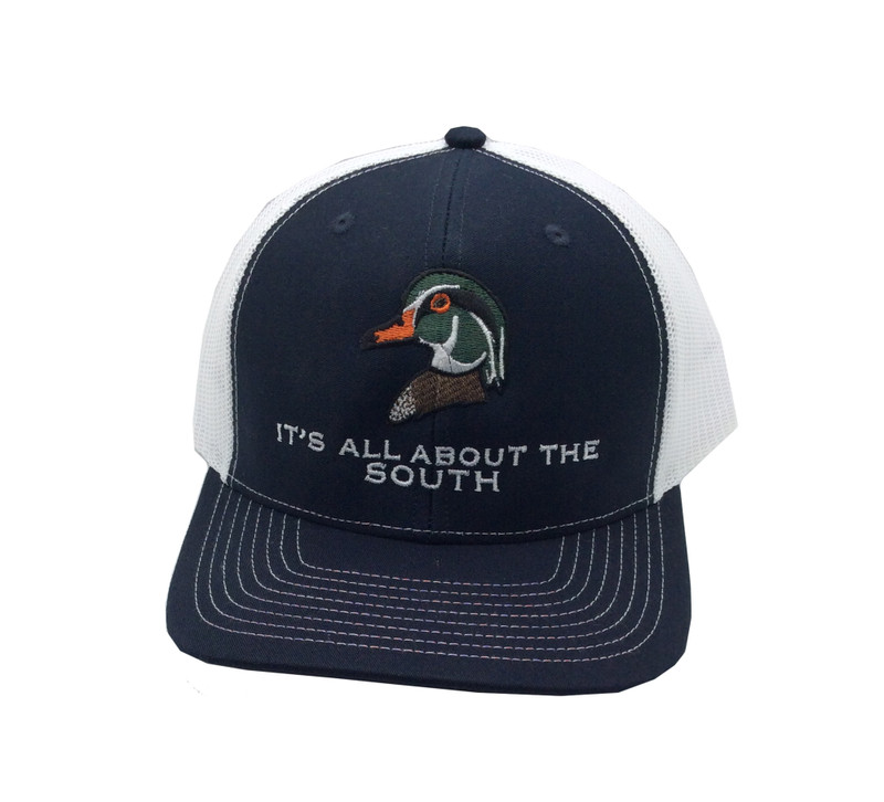 It's All About The South 'Wood Duck'. Originating in Statesboro Georgia It's All About the South clothing apparel mixes quality clothing with the different passions of the South! Whether it be tailgating, hunting, fishing, or farm life It's All About the South offers a true picture of what we Southerners are all about!!. Shape: MidPro. Visor: Pre-Curved. Sweatband: Cotton. Closure: Plastic Snap Adjustable. Size: Adult - One Size Fits Most. Shell 1: 60% Cotton 40% Polyester Shell 2: 100% Polyester