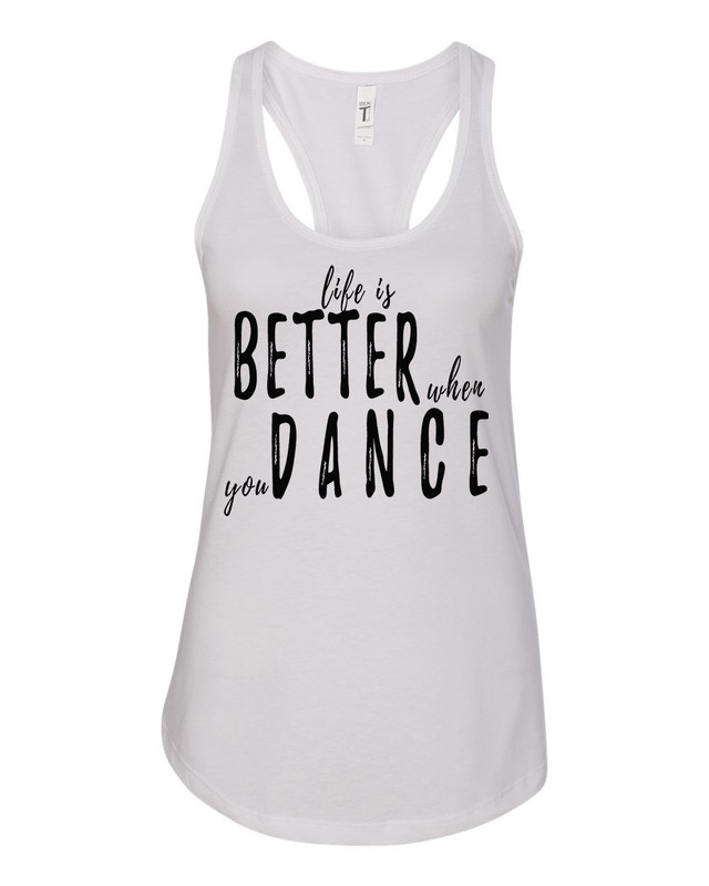 Check our latest design that reads Life Is Better When You Dance. This women's racerback tank top is sure to make a statement and let others know what you believe in and love. Made of a soft and comfortable 4 oz., 60% combed ringspun cotton 40% polyester lightweight jersey blend. The fabric has been pre-laundered for reduced shrinkage. Features self-fabric binding on neck and armholes as well as a tear-away label. Machine wash cold inside out. Tumble dry low. Multiple colors to choose from. Available in sizes XS-2XL. Treat yourself or give as a gift. Great for birthdays, holidays, and special occasions. We carry and ever-growing selection of apparel to suit the needs of the whole family. All of our tshirts are printed in-house by our professional production team. This guarantees that you are getting unique, one-of-a-kind design. Our graphic t-shirts are printed in the USA with state of the art equipment to ensure vibrant colors and lasting durability. We custom design apparel for all occasions: birthdays, holidays, Christmas, anniversaries, and more. Our apparel, hats, and tumblers make a great gift for your mom, dad, grandma, wife, husband, daughter, son, friends, and co-workers!