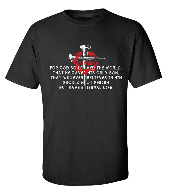 Show that you are a follower of Jesus Christ in this men's Christian tee. Features John 3:16: For god so loved the world, that he gave his only son, that whoever believes in him should not perish but have eternal life. This super comfortable tee is made of 6 oz., 100% preshrunk cotton. Ash grey is made of 99% Cotton and 1% polyester. Sport Grey and antique colors are made of a 90% cotton and 10% polyester blend. Heathered and safety colors are made of 50% cotton and 50% polyester. Features a tear away label for ultimate comfort and double-needle stitched sleeve and bottom hem. Seamless double-needle 7/8� ribbed collar with taped neck and shoulders. Safety Green is compliant with ANSI/ISEA high visibility standards.