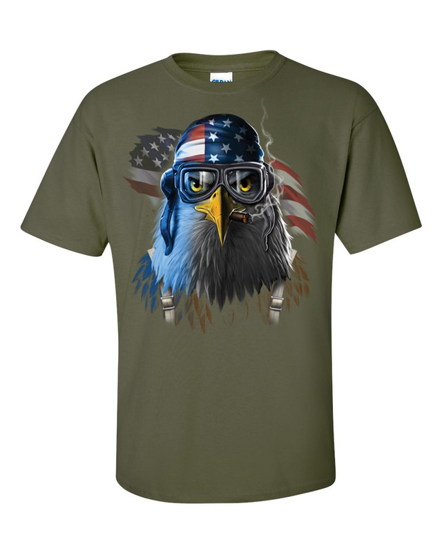 Features a tough looking, patriotic eagle in font of the American Flag. This super comfy tee is made of 6 oz., 100% preshrunk cotton. Ash grey, sport grey, and all other heather colors are a cotton/polyester blend. Double-needle stitched sleeve, hem, and 7/8†collar. Features a classic fit with taped neck and shoulders and a tear away label for maximum comfort and a perfect fit. We carry and ever-growing selection of apparel to suit the needs of the whole family. All of our tshirts are printed in-house by our professional production team. This guarantees that you are getting unique, one-of-a-kind design. Our graphic t-shirts are printed in the USA with state of the art equipment to ensure vibrant colors and lasting durability. We custom design apparel for all occasions: birthdays, holidays, Christmas, anniversaries, and more. Our apparel, hats, and tumblers make a great gift for your mom, dad, grandma, wife, husband, daughter, son, friends, and co-workers! Sarcastic, punny, or slightly offensive, we have something for every type of humor. Our tees are a great conversation starter that will get some laughs and turn heads everywhere you go. We cover a wide range of topics: Christian, military, patriotic, political, awareness, pop culture, pet rescue shirts and more.