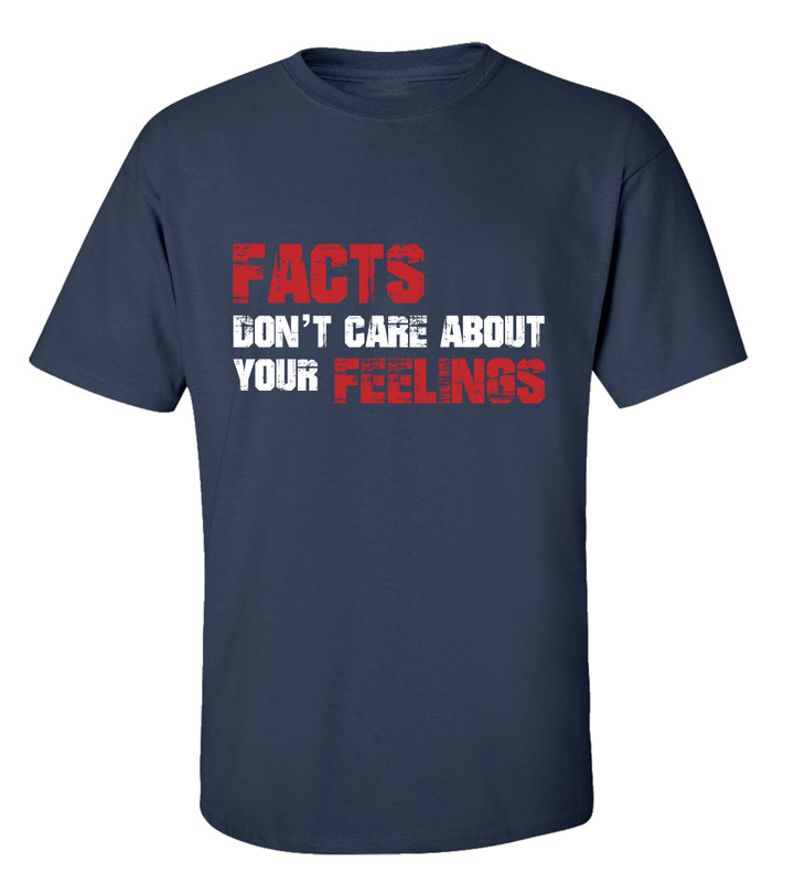 Check our latest design that reads "Facts Don't Care About Feelings". This political, anti-liberal tee is sure to make a statement and let others know what you stand for. Made of 100% Cotton; Heathered Styles are made of a cotton/polyester blend. Machine wash cold inside out; Tumble dry low. Unisex Sizing; Great for both men and women. We carry and ever-growing selection of apparel to suit the needs of the whole family. All of our tshirts are printed in-house by our professional production team. This guarantees that you are getting unique, one-of-a-kind design. Our graphic t-shirts are printed in the USA with state of the art equipment to ensure vibrant colors and lasting durability. We custom design apparel for all occasions: birthdays, holidays, Christmas, anniversaries, and more. Our apparel, hats, and tumblers make a great gift for your mom, dad, grandma, wife, husband, daughter, son, friends, and co-workers! Sarcastic, punny, or slightly offensive, we have something for every type of humor. Our tees are a great conversation starter that will get some laughs and turn heads everywhere you go. We cover a wide range of topics: Christian, military, patriotic, political, awareness, pop culture, pet rescue shirts and more.