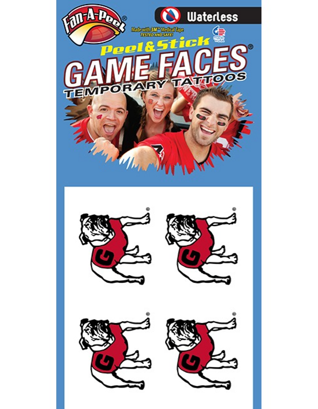 Represent the University of Georgia with these unique temporary tattoos! Sports fans want the world to know what team they support and these tattoos are the perfect way to show off your love of UGA. Featuring the classic standing bulldog logo with official team colors, they are a great last-minute addition to your game day outfit and the waterless application makes them an easy go to. You simply peel and stick for a long lasting, water resistant image. Removal requires no harsh scrubbing or alcohol and they are safe to use on most surfaces, such as skin, laptops, clothing and so much more! The temporary tattoos are made with 3M Hypoallergenic medical tape and have been tested and proven safe. Whether you are at the stadium, tailgating, or just watching the game from home, donÂ’t miss your chance to broadcast your Bulldog pride with these must haves!