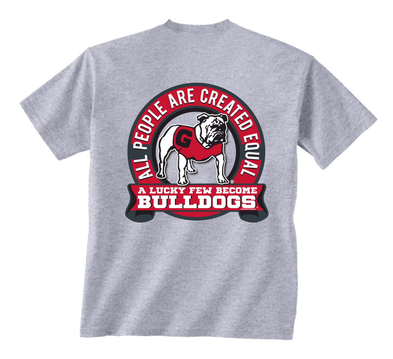 Show off your Georgia Bulldog pride in this officially licensed New World Graphics Short Sleeve T-shirt. This school spirited t-shirt will be the best shirt you will ever own. Made of a super soft and comfortable 100% cotton for ultimate comfort, superior fit, and durability. The front features a left chest screen-printed graphic of the standing Bulldog with Georgia Bulldogs underneath it. The front features a left chest screen-printed graphic of the American Flag. The back on the shirt features a large graphic design of standing bulldog. Around the bulldog reads "All People Are Created Equal" "A Lucky Few Become Bulldogs". The short sleeves and unisex fit make it a great addition to any Dawg fan's summer and springtime wardrobe. It's perfect for game day and many other occasions. Machine wash cold with like colors, do not bleach, tumble dry low. Turn inside out when washing to protect print for years to come. Great as a gift for birthdays, holidays, and other special occasions.