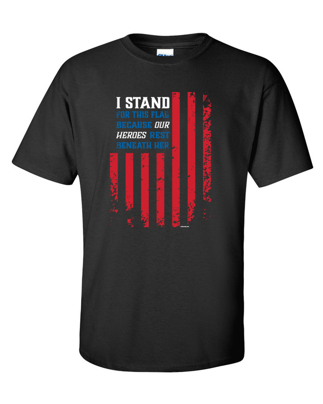 This is a reminder of why we stand for the American Flag. We owe our fallen heroes respect, they fought and died for this flag. This super comfy tee is made of 6 oz., 100% preshrunk cotton. Ash grey, sport grey, and all other heather colors are a cotton/polyester blend. Double-needle stitched sleeve, hem, and 7/8†collar. Features a classic fit with taped neck and shoulders and a tear away label for maximum comfort and a perfect fit. We carry and ever-growing selection of apparel to suit the needs of the whole family. All of our tshirts are printed in-house by our professional production team. This guarantees that you are getting unique, one-of-a-kind design. Our graphic t-shirts are printed in the USA with state of the art equipment to ensure vibrant colors and lasting durability. We custom design apparel for all occasions: birthdays, holidays, Christmas, anniversaries, and more. Our apparel, hats, and tumblers make a great gift for your mom, dad, grandma, wife, husband, daughter, son, friends, and co-workers!