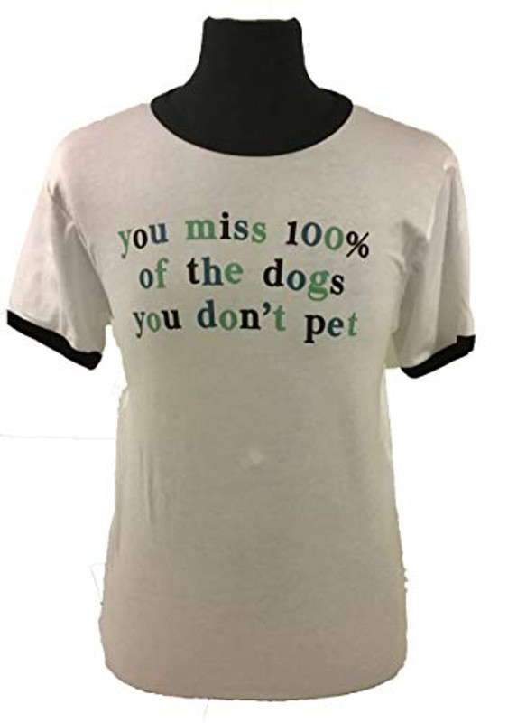 Check our Miss Dogs ringer short sleeve t-shirt by Jadelynn Brooke, this adorable tee reads “You miss 100% of the dogs you don’t pet”, this casual top looks great paired with leggings or your favorite jeans, made of 100% combed ring-spun cotton, color white with black trim, Women’s sizing makes it great for women, ladies, and juniors, this tee makes a great gift for any occasion; perfect for holidays, birthdays, and more