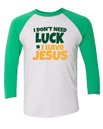 Christian St. Patrick's Day "I Don't Need Luck I Have Jesus" Adult Baseball Tee. This year celebrate St. Patrick's Day while showing off your Christian pride! This durable, comfortable T-shirt is sure to be a hit for anyone, whether you're buying it as a gift for somebody special or wearing it yourself. This listing is for a 4.3 oz., 50% polyester/ 25% combed ringspun cotton/ 25% rayon Tri-Blend Three-Quarter Sleeve Baseball Raglan Tee. Variety of colors and a large range of sizes are available. We carry and ever-growing selection of apparel to suit the needs of the whole family. All of our tshirts are printed in-house by our professional production team. This guarantees that you are getting unique, one-of-a-kind design. Our graphic t-shirts are printed in the USA with state of the art equipment to ensure vibrant colors and lasting durability. We custom design apparel for all occasions: birthdays, holidays, Christmas, anniversaries, and more. Our apparel, hats, and tumblers make a great gift for your mom, dad, grandma, wife, husband, daughter, son, friends, and co-workers!