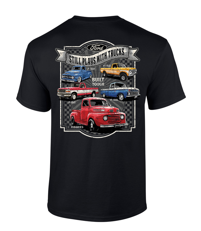 The Trenz Shirt Company F-100, F-150, F-Series Built Tough Still Plays With Trucks Graphic Short-Sleeve Men’s T-Shirt is the ultimate tee for truck lovers and Ford enthusiasts alike. Featuring a bold graphic that pays tribute to the legendary F-Series lineup — from the classic F-100 to the powerhouse F-150 — this shirt celebrates generations of trucks that are Built Tough and ready for anything. With the statement “Still Plays With Trucks,” it perfectly captures the spirit of those who never outgrew their love for rugged machines and the open road. Crafted from soft, breathable fabric, this short-sleeve t-shirt delivers all-day comfort whether you're working in the garage, heading to a truck meet, or just enjoying your day off. The relaxed men’s fit offers a flattering and comfortable silhouette, ideal for pairing with jeans, cargo pants, or shorts. The high-quality graphic print is built to last, staying vibrant and sharp even after repeated washes, so you can wear your passion proudly for years to come. Perfect for truck owners, classic Ford fans, and anyone who knows what it means to live the Built Tough lifestyle, the F-100, F-150, F-Series Built Tough Still Plays With Trucks T-Shirt is more than just a shirt — it’s a statement of who you are. Wear it with pride and keep your truck spirit alive.