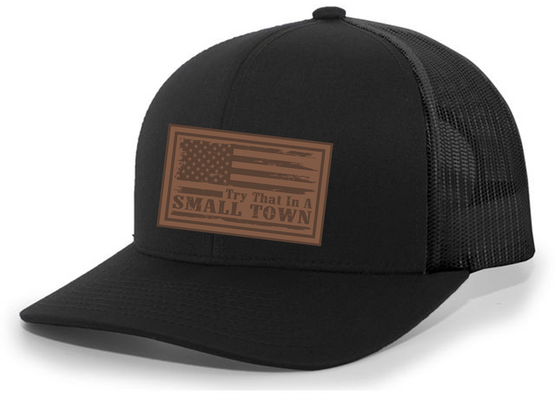Introducing the country "Try That in a Small Town" leather patch hat! Step into the world of country charm and rugged authenticity with our exclusive country "Try That in a Small Town" hat. Celebrate the spirit of the heartland and pay homage to one of country music's greatest icons, country, with this stylish and comfortable hat. This trucker hat is designed with a classic mesh back, allowing for breathability and comfort even during the warmest of days. The snap-back closure ensures a secure and customizable fit for any head size. The hat is made of high-quality materials, with a durable and sturdy construction that is built to last, making it perfect for everyday wear or your next country concert adventure. Unique Design: The hat features the bold phrase "Try That in a Small Town" engraved onto a leather patch, capturing the essence of small-town pride and the fearless attitude that comes with it. Let your wardrobe speak volumes about your love for country music and the laid-back lifestyle. Versatile Style: Pair it with your favorite jeans, shorts, or t-shirts for a casual yet trendy look. Whether you're out for a night on the town or just relaxing with friends, this hat effortlessly enhances your country-inspired ensemble. Ideal Gift: Are you searching for the perfect gift for a country music enthusiast or a die-hard country fan? Look no further! This hat is the ultimate present that will put a smile on their face and warm their heart. Get ready to embrace the rugged charm and adventurous spirit of small-town living with the country "Try That in a Small Town" hat. Order yours today and let your country soul shine!