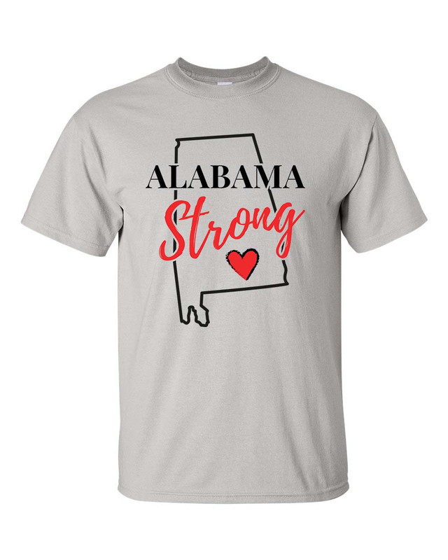 Reads: Alabama Strong and features the Alabama state outline. Show love for your home state or your favorite state away from home in this super cute unisex fit tee. This t-shirt showcases your state outline, state name, and a heart. This super comfy tee is made of 6 oz., 100% preshrunk cotton. Ash grey, sport grey, and all other heather colors are a cotton/polyester blend. Safety colors are a 50/50 cotton and polyester blend. Double-needle stitched sleeve, hem, and 7/8†collar. Features a classic fit with taped neck and shoulders and a tear away label for maximum comfort and a perfect fit. This is a back print t-shirt with a small crest on the front left chest. Sizes Small-5X. Custom screen printing done in the USA. We custom print all 50 US states. Ice Grey. We carry and ever-growing selection of apparel to suit the needs of the whole family. All of our tshirts are printed in-house by our professional production team. This guarantees that you are getting unique, one-of-a-kind design. Our graphic t-shirts are printed in the USA with state of the art equipment to ensure vibrant colors and lasting durability. We custom design apparel for all occasions: birthdays, holidays, Christmas, anniversaries, and more. Our apparel, hats, and tumblers make a great gift for your mom, dad, grandma, wife, husband, daughter, son, friends, and co-workers!