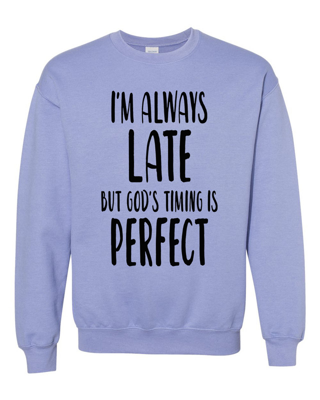 Always Late But God's Timing Is Perfect! Made of a super soft and comfortable 50% cotton and 50% Polyester blend. Constructed from pill-resistant air jet yarn, and features double-needle stitching throughout. The 1x1 ribbed collar, cuffs, and waistband are made with spandex for the perfect amount of stretch. Set in sleeves. We carry and ever-growing selection of apparel to suit the needs of the whole family. All of our tshirts are printed in-house by our professional production team. This guarantees that you are getting unique, one-of-a-kind design. Our graphic t-shirts are printed in the USA with state of the art equipment to ensure vibrant colors and lasting durability. We custom design apparel for all occasions: birthdays, holidays, Christmas, anniversaries, and more. Our apparel, hats, and tumblers make a great gift for your mom, dad, grandma, wife, husband, daughter, son, friends, and co-workers! Sarcastic, punny, or slightly offensive, we have something for every type of humor. Our tees are a great conversation starter that will get some laughs and turn heads everywhere you go. We cover a wide range of topics: Christian, military, patriotic, political, awareness, pop culture, pet rescue shirts and more.