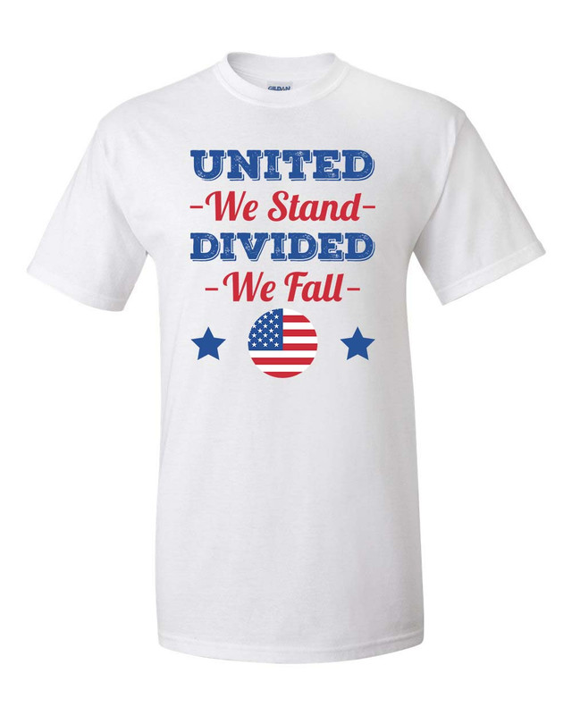 Show love for the greatest country in the entire world, the USA. If you love the United States of America this is the shirt for you. Features the traditional red, white, and blue colors and the words “United we stand divided we fallâ€. This is perfect for the fourth of July, or any other time you want to show off that you are a true patriot. This super comfy tee is made of 6 oz., 100% preshrunk cotton. Ash grey, sport grey, and all other heather colors are a cotton/polyester blend. Double-needle stitched sleeve, hem, and 7/8†collar. Features a classic fit with taped neck and shoulders and a tear away label for maximum comfort and a perfect fit. We carry and ever-growing selection of apparel to suit the needs of the whole family. All of our tshirts are printed in-house by our professional production team. This guarantees that you are getting unique, one-of-a-kind design. Our graphic t-shirts are printed in the USA with state of the art equipment to ensure vibrant colors and lasting durability. We custom design apparel for all occasions: birthdays, holidays, Christmas, anniversaries, and more. Our apparel, hats, and tumblers make a great gift for your mom, dad, grandma, wife, husband, daughter, son, friends, and co-workers!