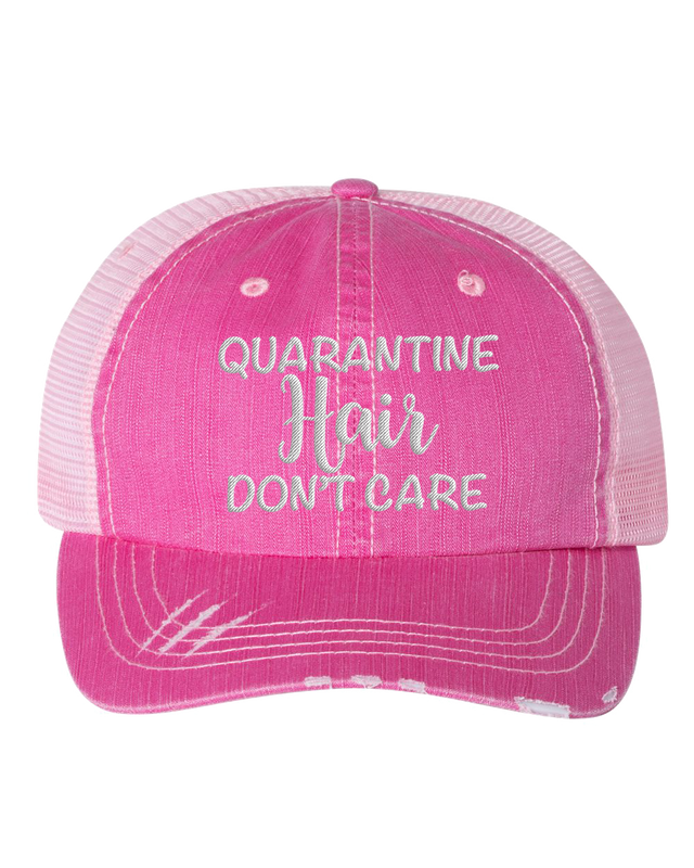 Quarantine Hair Don't Care. Since we have all been at home social distancing, there is no need to fix your hair! Just throw on this cute hat and go! Embroidered in the USA. Great hat for spring and summer to stay cool and shaded. Made of 65% cotton and 35% polyester herringbone fabric. Mesh Back is made of 100% Polyester. Features an unstructured, six-panel, low-profile fit. The visor is curved and pre-frayed for a worn look. Hook and loop closure. We carry and ever-growing selection of apparel to suit the needs of the whole family. All of our tshirts are printed in-house by our professional production team. This guarantees that you are getting unique, one-of-a-kind design. Our graphic t-shirts are printed in the USA with state of the art equipment to ensure vibrant colors and lasting durability. We custom design apparel for all occasions: birthdays, holidays, Christmas, anniversaries, and more. Our apparel, hats, and tumblers make a great gift for your mom, dad, grandma, wife, husband, daughter, son, friends, and co-workers!